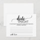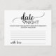 Ces simples cartes d'idées de nuit en calligraphie noire sont l'activité idéale pour une réception de mariage rustique ou moderne ou une douche nuptiale. Le design minimaliste est doté d'une police de caractères élégante et d'un coeur féminin. Personnalisez ces cartes avec le nom de la mariée et du marié. Le panneau Date Jar est vendu séparément.