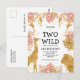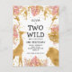 Cette carte d'invitation pour la fête d'anniversaire des 2 ans sur le thème du safari jungle "deux sauvages" comporte des animaux en feuille d'or faux (girafe, lion et singes), du feuillage de jungle rose et or, et une pincée de confettis dorés sur fond blanc. Ajoutez le nom de la fille qui fête son anniversaire et les détails de la fête en noir ainsi que votre adresse de retour au verso.