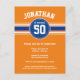 Des rayures bleu royal et un fond orange mettent en valeur cette carte d'invitation pour une fête d'anniversaire sur le thème du sport. Le design comprend un motif de maillot de sport avec un espace pour mettre en évidence le nom et l'âge du garçon qui fête son anniversaire.
