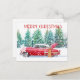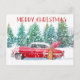 Une carte de voeux de Noël avec une voiture rouge vintage dans la neige.