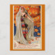 Jolie carte d'Halloween vintage montrant une jolie jeune femme contre un arrière - plan d'étoiles et de citrouilles souriants.