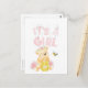 Typographie adorable, design baby shower "It's a Girl" avec un mignon ours en peluche à fleurs roses et un tonneau de miel regardant une jolie abeille au miel. La typographie en lettré rose amusante est collée au sommet avec de jolies cordes et agiter vers le bas. Fleurs roses et modèles pour créer votre propre invitation sur le dos.