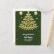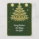 Une illustration festive mettant en vedette un arbre de Noël doré orné de décorations, entouré de flocons de neige décoratifs et d'éléments festifs, sur un fond vert foncé, évoquant la chaleur et la joie saisonnière.