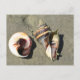 Carte postale de coquillages vierges avec photo d'un conque de cime et d'une coquille de requin. Les deux coquilles sont inclinées pour montrer l'ouverture (ouverture) et les points de la couronne sont clairement visibles. Les deux coquillages sont posés sur du sable de plage. Reverse est vide et les cartes peuvent être utilisées pour n'importe quelle occasion.