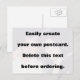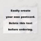 Créez facilement votre propre carte postale photo. Changez d'image avec votre propre photo et cliquez sur Personnaliser pour redimensionner l'image, choisissez la taille et la couleur de la police et fabriquez votre carte postale unique. Orientation horizontale mais vous pouvez facilement l'orienter verticale. N'oubliez pas de supprimer le gros texte avant de commander.