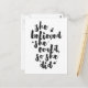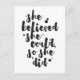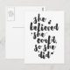 Carte postale inspirante affichant l'expression "Elle croyait qu'elle le pouvait, alors elle l'a fait" dans un script en brosse noire avec une texture d'encre organique pour obtenir un look authentique, lettré à la main.