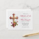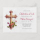 Carton d'invitation pour célébration de vie avec une illustration charmante représentant une simple croix en bois recouverte de fleurs roses et de feuilles vertes.