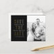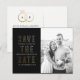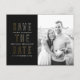 Un simple et moderne enregistrer la carte postale de date avec des accents classiques noir, blanc et faux or fait ressortir votre photo fiançailles et envoie à votre invité mariage les informations dont il a besoin pour planifier la célébration de votre mariage avec un monogramme chic d'un couple dans des anneaux mariages entrelacés. Facile à customiser texte fait de cette carte postale un choix intelligent!