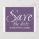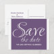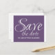 Calligraphie Enregistrer la date Carte postale en violet et blanc avec un design de typographie sophistiqué. Cette carte postale de date élégante et chic est facile à customiser avec vos détails de mariage. Pour plus d'options de personnalisation, cliquez sur le bouton Customiser.