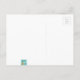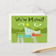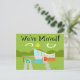 Cette carte postale "Changement d'adresse" représentant une maison rétro de Palm Springs est le rêve d'un amateur de style moderne du milieu du XXe siècle. Le design artistique minimaliste présente une maison élégante orange et verre avec un toit en forme de coche dramatiquement incliné. La porte rouge contraste avec la jardinière en pierre orange remplie de verdure et l'écran de confidentialité en parpaings de verre turquoise décoratif. Des blocs de béton décalés forment un chemin parfait à travers la pelouse verte luxuriante. Un carport blanc abrite une voiture classique turquoise et blanche des années 1950 avec des ailerons. La voiture est parfaite pour rouler autour des montagnes vertes et arrondies à l'arrière-plan. La maison de style kitsch des années 1960 ressemble à une oasis ombragée protégée du soleil chaud de Palm Springs. Le haut de la carte indique "Nous