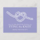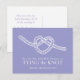 Simple carte postale moderne de mariage 'Cœur nouant le nœud' en violet et blanc. Nouer le nœud est un symbole classique pour montrer l'union de deux personnes en une unité durable et entrelacée. Dessin simple de nœud et conception de Sarah Trett www.sarahtrett.com pour www.mylittleedenweddings.com