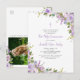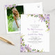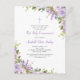 Cartes d'invitation personnalisées pour la Première Communion à prix abordable. Ce joli design féminin comporte une bordure florale à l'aquarelle avec des fleurs pastel violettes et de la verdure. Personnalisez le design avec les détails de la Première Communion de votre enfant. Le verso comporte un espace pour une photo avec votre adresse de retour imprimée pour un envoi facile. Cliquez sur Personnaliser pour choisir n'importe quelle couleur de fond et modifier les polices et les couleurs du texte pour créer une invitation de Communion unique en son genre.