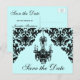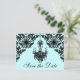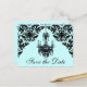 Cette carte de rappel de type carte postale damas à lustre aqua bleu et noir correspond à l'invitation de mariage présentée ci-dessous. Si vous avez besoin d'autres articles assortis, veuillez envoyer un e-mail à niteowlstudio@gmail.com avec votre demande.