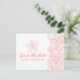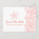Dessin simple contour en blanc et corail orange rose d'une étoile de mer, avec des tourbillons de vagues graphiques, carte de rendez-vous de mariage. Belle carte de mariage corail rose orange et blanc à envoyer à l'avance des invitations. Une invitation parfaite pour un mariage plage, inspiré de la côte océanique ou de la destination de la mer. Modifiez cette invitation avec vos propres mots. Conçu et dessiné de manière unique par Sarah Trett.