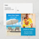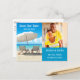 Cette carte moderne est idéale pour annoncer un mariage de plage ou de destination. Elle comporte une belle et sereine image d'une côte de plage, et une photo du couple sur le côté droit. Il y a deux chaises de plage et un parasol sur le sable. Cette carte est idéale pour un mariage en bord de mer. Ajoutez vos propres détails d'événement.