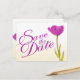 Belle tulipe violette unique et lumineuse sur une invitation de mariage informelle de sauvegarde de date couleur crème rustique. Personnalisez cette invitation avec vos propres mots. Invitation simple moderne et romantique, idéale pour un mariage de printemps ou de fleurs de tulipes. Conception et peinture de tulipe à l'aquarelle par Sarah Trett.