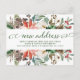 Cette carte de vœux tendance pour les fêtes de fin d'année présente un cadre de fleurs de Noël rouges et blanches à l'aquarelle, avec une verdure festive, des pommes de pin et des baies. Les mots "nouvelle adresse" apparaissent dans une calligraphie verte élégante et tourbillonnante. Une annonce de déménagement pour Noël simple mais élégante que vous serez fier d'envoyer à vos amis et à votre famille.