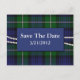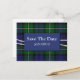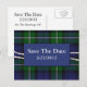 Mariage élégant enregistrer la carte de poste de date faite dans le traditionnel plaid de Forbes vert et bleu tartan. De belles images d'un double fil de perles, avec une plaque bleue et un texte blanc décore le motif plaid. Tout le texte, sur la plaque avant et à l'arrière de la carte, est entièrement personnalisable pour lire ce que vous voulez.