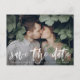 Élégante et moderne carte postale de sauvegarde de date avec une police de caractères manuscrite moderne blanche en surimpression. Personnalisez les cartes modernes de sauvegarde de date en ajoutant vos noms, les détails du mariage et votre photo de fiançailles préférée. La photo utilisée dans ce design est à des fins d'affichage uniquement et n'est pas destinée à la revente.