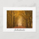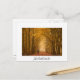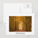 Carte postale d'une femme faisant une promenade avec son chien à travers le brouillard matinal sur un chemin dans une forêt de hêtres en automne couleurs avec une bordure blanche et le texte : 'Pays-Bas'.