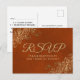 Ces cartes-réponses RSVP faciliteront la tâche à vos invités pour qu'ils correspondent à votre invitation de mariage. Elles présentent un design typique avec un texte doré sur un fond marbré orange rouille ou brun châtaigne. Les coins de la carte sont ornés d'une fine dentelle florale en filigrane. Le verso comporte un espace pour indiquer le nombre d'invités et un choix de repas. Belle enveloppe pour vos invitations de mariage.