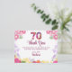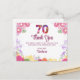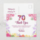 Floral 70e anniversaire merci carte postale 70 fleur chic. Montrez votre gratitude dans le style avec cet élégant carte de remerciements de 80e anniversaire avec des accents floraux vibrants et un message sincère. L'avant de la carte affiche un grand "70" au design floral coloré et les mots "Merci" en gras, suivi d'un message personnalisable. Le côté arrière présente une note d'appréciation touchante pour célébrer un jalon de 80 merveilleuses années remplies d'amour, de rire et de souvenirs. Cette carte est le moyen parfait pour express vos remerciements pour avoir assisté à votre journée spéciale et pour tous les cadeaux généreux reçus. Personnalisez facilement cette carte de remerciements pour refléter vos propres sentiments uniques. Bon appétit !