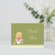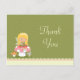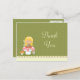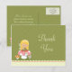 Cette adorable fête d'anniversaire de filles merci carte postale a un thème de fée. Il y a une fée aux cheveux blonds assis sur un champignon avec une petite souris en dessous. L'arrière - plan est de couleur vert olive avec des à petits pois. Le fond est recouvert d'un bord de pétoncle couleur crème avec une bande rose. Copyright © Zenware Designs com