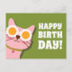 Célébrez la journée spéciale de quelqu'un avec notre charmante carte d'anniversaire illustrée d'un adorable chaton rose portant des lunettes stylées sur un fond vert vibrant ! Cette illustration tendance capture l'essence du plaisir et de la fantaisie, ce qui en fait la façon parfaite de illuminer l'anniversaire de n'importe qui.
