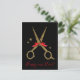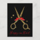 Bonne année = Joyeux nouveau Cheveux! Ces ciseaux à parties scintillant dorée font une carte parfaite pour votre entreprise. Texte facile à ajuster ! Une combinaison classique de couleurs noir et or. Elégant modèle coiffeur styliste avec un ruban rouge.