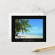 Carte postale d'un kayak jaune sous un palmier suspendu sur une plage de sable blanc sur l'île tropicale de Moorea, près de Tahiti, dans l'archipel Pacifique Polynésie française avec une frontière noire et le texte : "Moorea".
