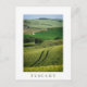 Carte postale d'un paysage presque abstrait avec des lignes vertes courbées dans les champs d'orge entre Pienza et San Quirico d'Orcia dans la vallée du Val d'Orcia en Toscane, Italie dans une forme élégante avec une bordure blanche et le texte : 'Toscane'.