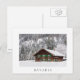 Carte postale d'une maison traditionnelle en bois rond cabine avec volets verts dans une forêt dans la neige en hiver en Bavière à la frontière entre l'Allemagne et l'Autriche avec une frontière blanche et le texte : 'Bavière'.