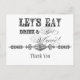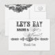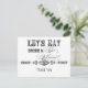 Des polices élégantes et amusantes annoncent le message, "Mangeons, buvons et marions-nous !" sur une carte postale charmante et fantaisiste. Dans une palette de couleurs propres, nettes, noires et blanches, c'est le meilleur de vintage avec une touche moderne. Vos noms se trouvent au bas de la vaste zone d'écriture pour personnaliser le design.