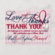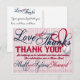 BASEBALL MARIAGE MERCI POSTCARD 1-*Cette carte de remerciement est customisée pour un CLIENT SPÉCIFIQUE SEULEMENT. Celui-ci est pour eux. Un autre nom de départ sera disponible. À propos du design : L'arrière - plan est recouvert de fines rayures verticales rouges et blanches. Texte décoratif sur le dessus : Amour et Merci. Ensuite, il y a le texte rouge décoratif qui dit : MERCI ! dans les lettres imprimées. Ensuite, un petit texte rouge dit : pour nous avoir aidés à célébrer notre amour et notre union. La fête a été une Home Run ! Signature en verre décoratif avec le nom de la mariée et des mariés. Une petite bordure horizontale de minuscules billes coule à travers le fond. L'arrière de la carte postale est également orné d'ornements. Le texte en verre Love and Thanks, les couples nomment texte en verre et diviseur vertical de baseball. Ce design est disponible comme indiqué en rouge et aussi en bleu.