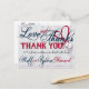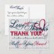 BASEBALL MARIAGE MERCI POSTCARD 2b-*Cette carte de remerciement est customisée pour un CLIENT SPÉCIFIQUE SEULEMENT. Celui-ci est pour eux. Un autre nom de départ sera disponible. A propos de la conception : L'arrière - plan est recouvert de fines rayures verticales bleues et blanches. Verre décoratif Texte sur le dessus : Amour et Merci. Le texte rouge décoratif suivant se lit : MERCI! dans les lettres imprimées. Une note personnalisée en noir cursif passe avant la signature. Signature en verre décoratif avec le nom de la mariée et des mariés. Une petite bordure horizontale de minuscules billes coule à travers le fond. L'arrière de la carte postale est également orné d'ornements. Le texte en verre Love and Thanks, les couples nomment texte en verre et diviseur vertical de baseball. Ce design est disponible comme indiqué en bleu et aussi en rouge. N'oubliez pas de customiser les notes avant et arrière dans votre propre texte. Modifiez les zones de texte ou supprimez/effacez-les pour une carte blanche.