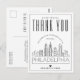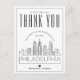Une excellente façon de rendre hommage à l'invité qui a voyagé si loin de son chemin pour vous voir, dans cette belle ville. Cette carte postale de remerciement spéciale est adaptée à l'invité qui a assisté à votre mariage dans la belle ville de Philadelphie, Pennsylvanie. Il dispose d'une ligne d'horizon stylisée de la ville sur le devant de la carte. Au contraire, vous trouverez un endroit pour votre propre message unique. Utilisez les fonctions de personnalisation pour même ajouter une photo si vous le souhaitez.