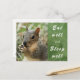 Une carte postale montrant un écureuil en train de manger heureux — lui souhaitant de se remettre/ de se réunir bientôt. L'objectif de cette carte postale est de rendre le receveur heureux et de l'encourager à se déplacer dans la vie ou de le prendre facilement dans leur vie stressante. thème : écureuil, animaux, animal, nature, heureux, va bien. couleur: vert, blanc, marron. (n'hésitez pas à customiser la photo et le texte)