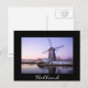 Carte postale avec un moulin à vent pendant un lever de soleil violet en hiver avec une fine couche de neige et de glace sur l'eau au site du patrimoine mondial de l'UNESCO Kinderdijk dans la Pays-Bas avec une bordure noire et le texte : 'Holland'.