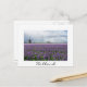 Carte postale d'un paysage avec un moulin à vent traditionnel et plusieurs moulins à vent modernes pour générer de l'énergie verte derrière un champ avec la fleur d'hyacinthe violet dans la région bulbe en Hollande avec une bordure blanche et le texte : 'Holland'.