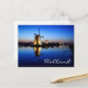 Carte postale des moulins à vent historiques illuminés au crépuscule pendant l'Heure Bleue avec réflexion dans l'eau dans un paysage de Kinderdijk, le Pays-Bas avec le texte : 'Holland'.