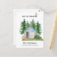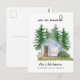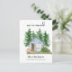 Nous avons déménagé - nouvelle carte de faire-part à domicile avec une aquarelle illustrant un petit cabine bleu dans les bois.