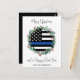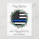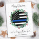 Envoyez Joyeux voeux de Noël à vos amis et votre famille avec cette carte de Noël unique en ligne Bleue Bleue Bleue Mince - Couronne de Noël dans un drapeau américain aux couleurs du drapeau de la police, design moderne noir bleu et blanc avec sainte et baies. Personnalisez avec le nom de famille. Cette carte de Noël de la police est parfaite pour les familles de policiers ou les cartes de Noël du service de police. DROIT D'AUTEUR © 2022 Judy Burrows, Black Dog Art - Tous droits réservés. Carte postale de Noël de la police budgétaire