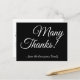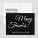 Cette carte postale de remerciement respectable et élégante comporte le message "Merci beaucoup!" sur le devant, ainsi qu'un message personnalisable sur le dos. Il pourrait être utilisé pour témoigner de l'appréciation à quelqu'un qui a assisté à un mariage, à des funérailles, à un diplôme ou à un autre événement.
