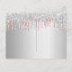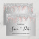 Une carte "Save the Date" féminine et tendance pour une fête d'anniversaire de 50 ans (ou tout autre âge). Un fond métallisé argenté décoré de gouttes de paillettes rose gold et argentées. Personnalisez et ajoutez une date et un nom/âge 50. Lettres de couleur rose gold foncé. Le texte : Save the Date est écrit avec un grand style de lettre manuscrite tendance.