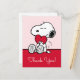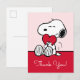 Envoyez vos remerciements avec la plus pure expression d'affection ! Cette belle carte de remerciement Snoopy présente le beagle adoré tenant doucement un cœur rouge vif sur un fond rose doux. C'est la carte parfaite pour exprimer une profonde gratitude, que ce soit pour un cadeau attentionné, un geste gentil ou pour célébrer l'amour à toute occasion. Le message à l'intérieur de la carte correspond à vos sentiments sincères. L'illustration classique de Snoopy en noir et blanc associée au fond rose doux crée un message de vœux instantanément chaleureux et affectueux que les destinataires vont chérir.