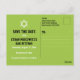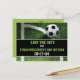 Ce Bar Mitzvah sur le thème du football enregistrer les coordonnées de la carte postale date avec l'invitation du Soccer Stadium at Night Bar Mitzvah et a un jeu de couleurs noir, vert et blanc. Le côté avant a une image arrière - plan d'un terrain de football à herbe verte montrant les lignes peintes en blanc du coin. Il y a un ballon de football noir et blanc au-dessus d'une zone de texte noir et blanc qui est un aperçu des détails du Bar Mitzvah qui sont imprimés sur le dos, qui est une couleur verte solide avec une étoile blanche de David en haut et le reste du texte dans un mélange de noir et blanc.