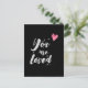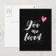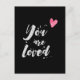 Carte postale inspirante affichant l'expression "You Are Loved" dans un script de brosse blanche avec une texture d'encre organique pour obtenir un look authentique, lettré à la main, et un coeur rose.
