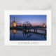 Carte postale de deux moulins à vent illuminés et un pont-levis avec réflexion dans l'eau du canal à la dernière lumière au coucher du soleil à Kinderdijk dans la Pays-Bas avec une bordure blanche et le texte : 'Pays-Bas'.