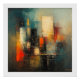 Ce design abstrait est à la fois dynamique et dynamique, caractérisé par une riche interaction de couleurs, de textures et de formes géométriques. L'oeuvre présente un fort sens de la verticalité et de l'horizontalité, suggérant un paysage urbain ou des structures architecturales abstraits. De grands blocs de couleur rectangulaires, particulièrement proéminents dans les tons blanc, jaune pâle et foncé, créent un sentiment de profondeur et de dimension. Ces blocs sont entrecoupés et superposés par de nombreuses lignes fines, rayées ou gravées, formant un motif en forme de grille qui ajoute à l'aspect urbain ou structurel. Le design évoque un sentiment d'énergie urbaine bouillonnante, peut-être une ville la nuit ou une interprétation vibrante et abstraite de l'architecture moderne. Les espaces lumineux semblent s'éclairer sur un fond plus sombre, donnant l'impression de fenêtres éclairées ou de lumières lointaines dans une structure complexe.
