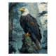 Un aigle chauve perché sur une branche robuste, son regard perçant fixé avec une focalisation intense. Le bec puissant et les talons tranchants de l’aigle sont clairement définis, et ses plumes sont richement détaillées, montrant le contraste frappant entre sa tête blanche et son corps foncé. Dans l'arrière - plan, une forêt brumeuse ou une falaise rocheuse s'évanouit au loin, avec de grands arbres remontant vers le haut, encadrant l'aigle dans son habitat naturel. La scène dégage une atmosphère calme mais chargée, incarnant la force et la vigilance.